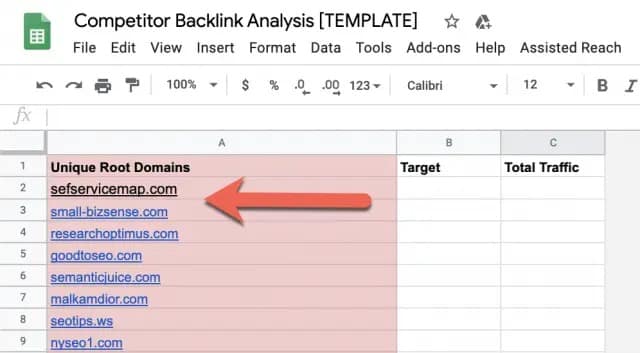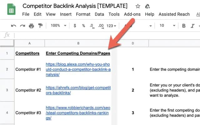 Once you’ve got a few competing domains (I recommend 3-5), paste their URLs into the How To Use tab in column B.