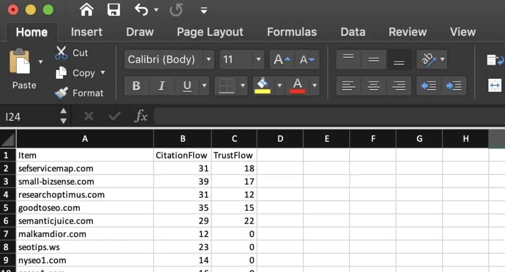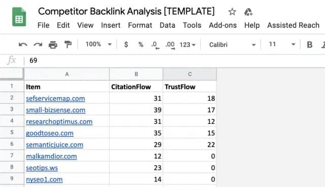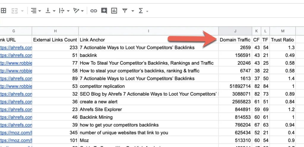 Repeat the process until you have trust flow and citation flow for every URL in column A on the comp_domain_traffic_data tab.