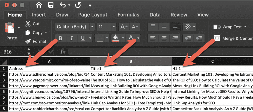 First, crawl your website and add all the URLs that you would like to rank for in Google into column A.